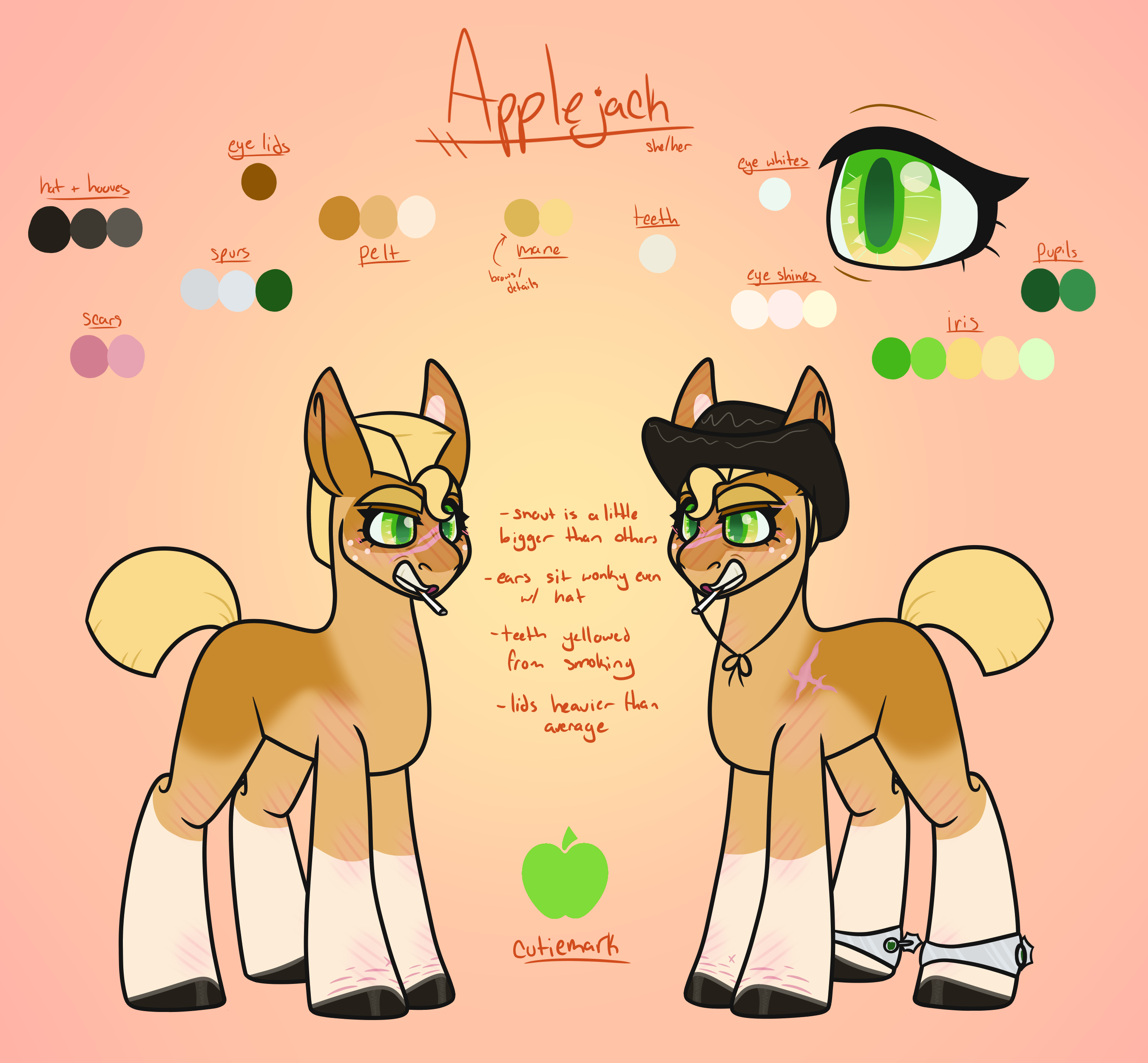 Hol Horse ass... Like canon Applejack, AJ is the middle child of the Apple family, and is a strong, hard worker responsible for taking care of her family's farm. Unlike her canon counterpart, this Applejack is a hotheaded brawler, a relentless sleazy flirt, and kind of a fightslut. AJ spends her days working on the farm with her family, then works off her stress in an underground Fight Club and smoking her body weight in cigarettes. She's HEAVILY based on Hol Horse, but without his cowardly personality. She sucks in a way I find very, VERY fun. She's also got a heart of gold in there, buried under a lot of layers. Applejack doesn't like being hurt any way but physically; she tries (and fails) to keep her distance from others in any real way.