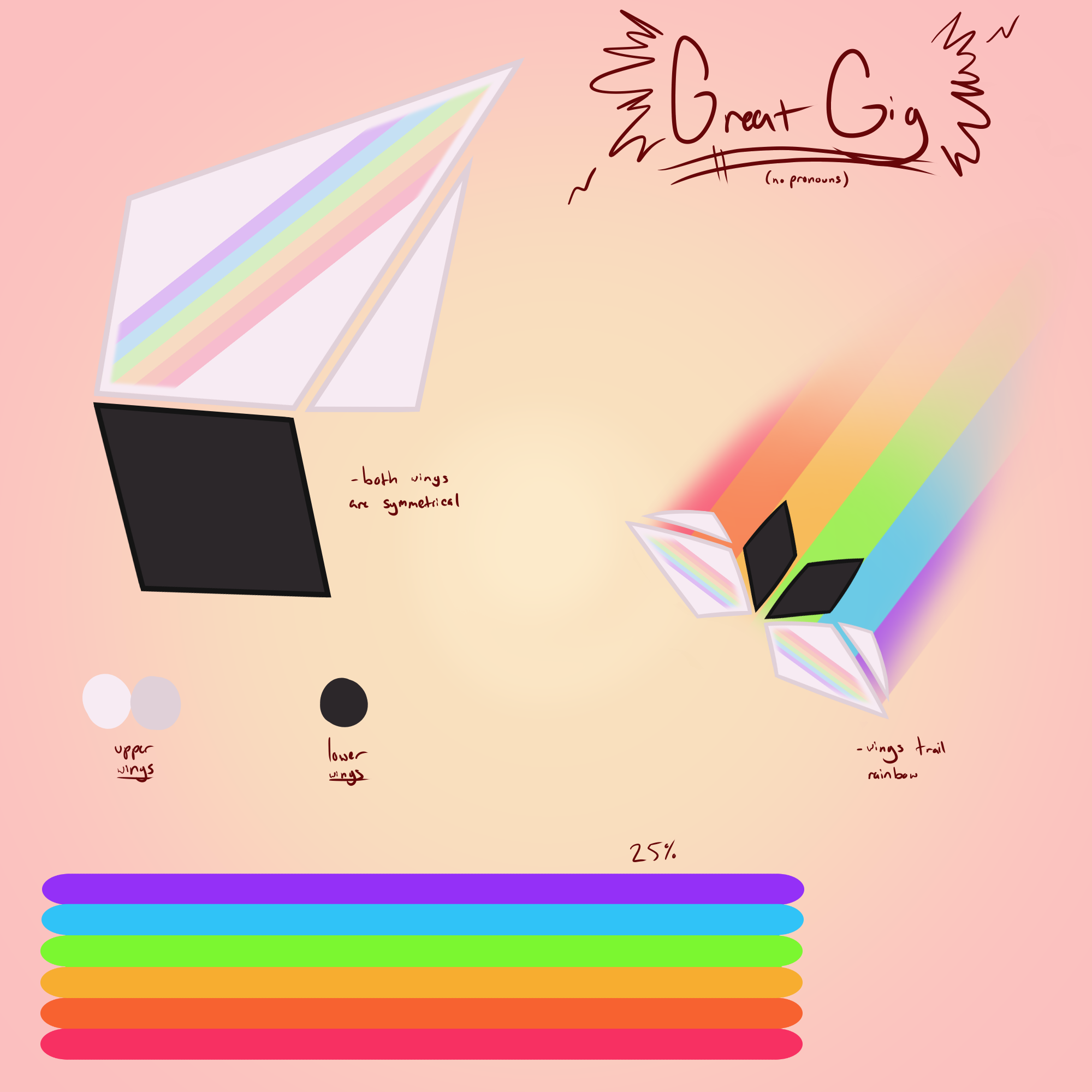 Rainbow's Stand is [Great Gig], named after the Pink Floyd song; I really wanted to use Dark Side of the Moon as visual inspiration for her Stand. [Great Gig] manifests as a pair of large, angular wings. Since all ponies in this universe are earth ponies, I knew I had to use Rainbow's Stand to let her fly lol. It's like. Her main thing! She doesn't have to flap with [Great Gig], as basically all control over her flight is done via her mind, but she has to take physics into account at least, since no amount of psychic control can pull her up out of a too steep dive. Rainbow's primary role in fights is swooping around to divebomb enemies, usually being more of a nuisance that doing actual damage.