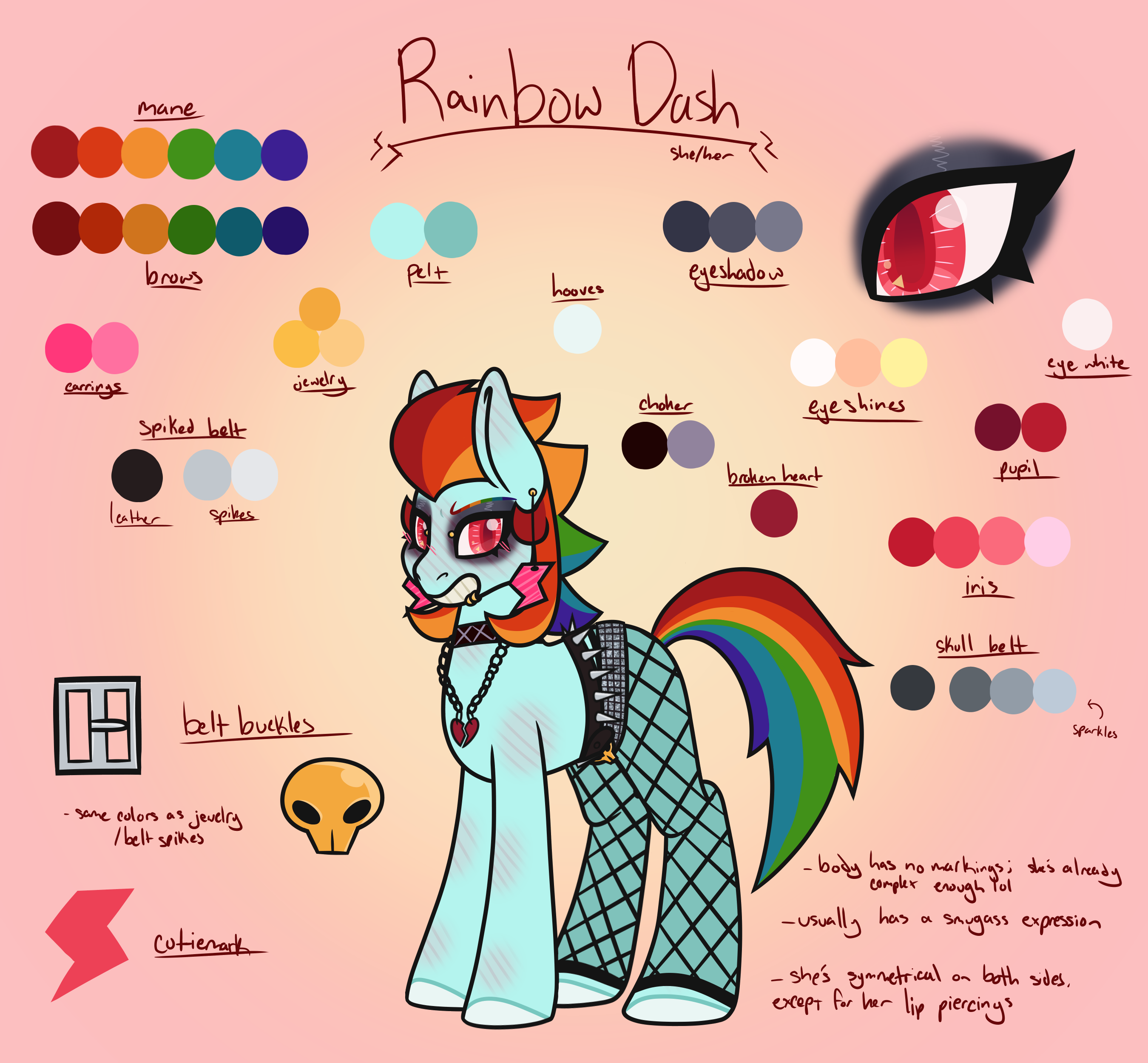 Everyone's favorite lil shit. Rainbow Dash is cocky and braggadocious, and a MISERABLE sore loser. All that attitude hides an anxious, insecure core; Rainbow has never been sure any pony likes her for reasons that don't benefit them. It makes her kind of a pill to be around, but as she's the youngest of the Mane Six, they're all pretty sure she'll grow out of it.